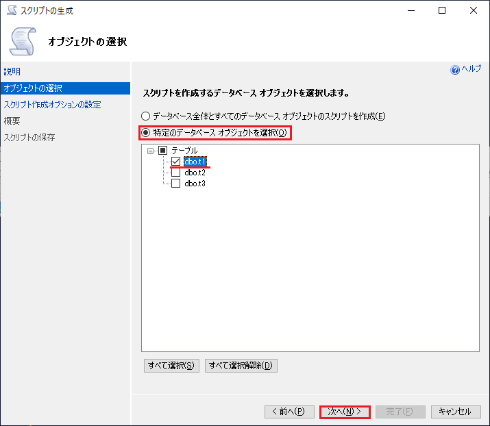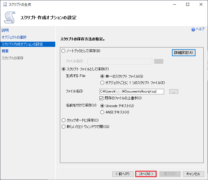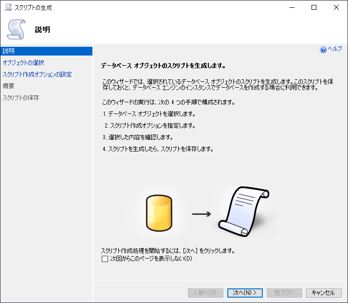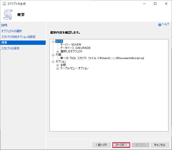 - スクリプトの生成オプションの設定画面の「次へ」ボタンを押下します。