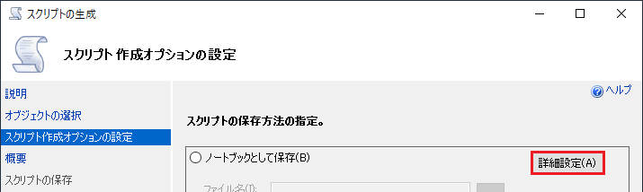 - スクリプトの生成オプションの設定画面の「詳細設定(A)」ボタンを押下します。