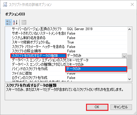 - スクリプトを作成するデータの種類を「データのみ」に変更します。